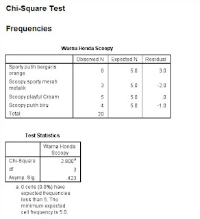 Dari hasil output dapat kita ketahui bahwa pada bagian Warna Honda Scoopy kolom Observed N masing-masing warna pilihannya berbeda, artinya warna Sporty putih bergaris orange 8 orang, warna Scoopy sporty merah metalik 3 orang, warna Scoopy playful Cream 5 orang, warna Scoopy putih biru 4 orang. jadi jumlah keseluruhan pemilih ada 20 orang. Pada kolom Expected N dapat dijelaskan karena pilihan responden tidak semua warna sama, maka masing-masing warna yang dipilih berbeda, jadi anggapan manajer dalam hal ini sudah mendekati kebenarannya (nilai 5 diperoleh dari 20 responden dibagi 4 warna). sedangkan Residual tersebut artinya sisanya dari masing-masing warna (nilai residual+expected atau nilai ecpected-residual maka akan menghasilkan nilai observed N setiap warna).